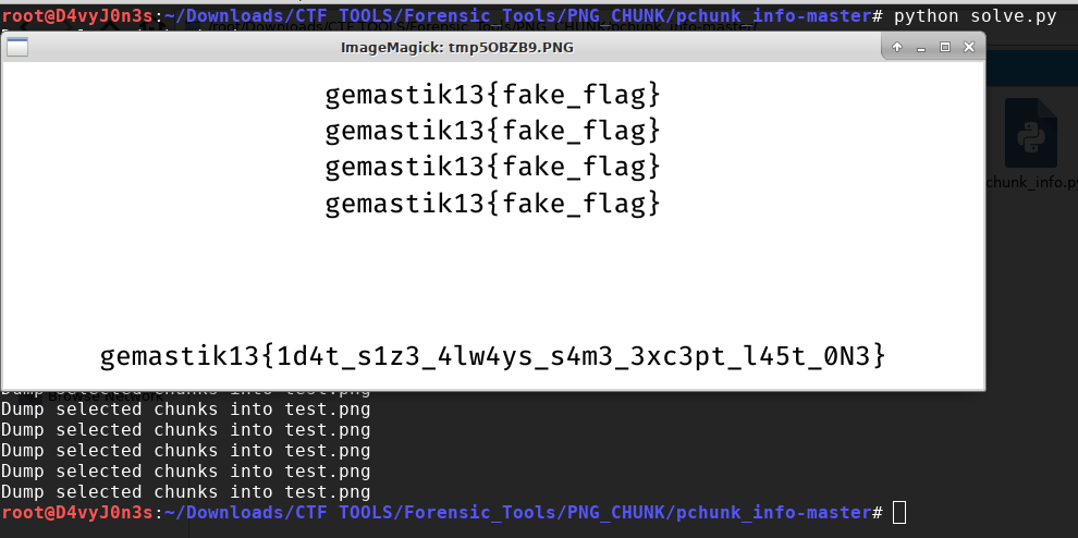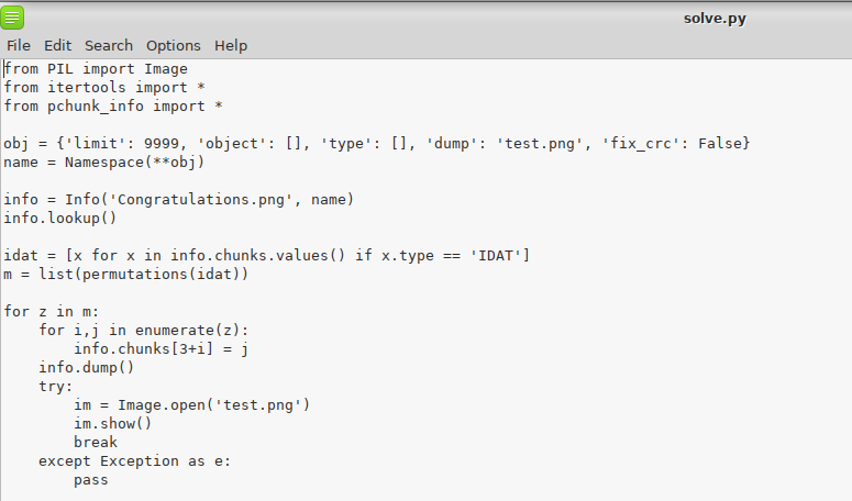kemudian kami asumsikan pngchunk, dan untuk recover png ini kita harus melakukan correction pada IHDR, sRGB, pHYs, dan IDAT. Solve dengan script berikut :