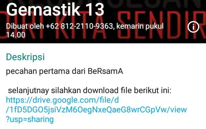 Pada announcement di discord gemastik didapatkan direct link dan hasilnya kami di arahkan menuju sebuah grup WhatsApp. Deskripsi di grup WA tadi kami diberikan sebuah petunjuk berikutnya sekaligus pecahan pertama.