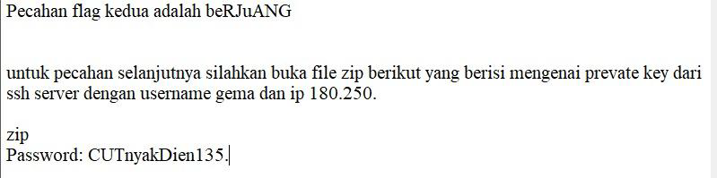 Extract zip dengan password yang didapatkan, terdapat private key bernama myPrivate.ppk yang di generate dari PuTTYGen. Lalu convert menjadi openssh key dan connect ke ssh nya dengan user gema@180.250.135.6 dan menggunakan private key yang sudah diconvert tadi.
